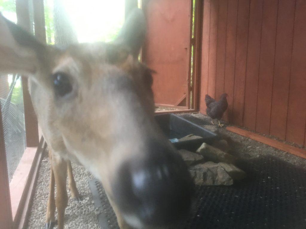 As a gedanken experiment, I compared the degree of sentience between a chicken and a cow. I didn’t get very far because I haven’t met many chickens or many cows. I recalled an instance at a wildlife rescue where I encountered Cookie and Barbara, a deer and a chicken who had become fast friends. They sought each other out in the morning and would, together, traipse about the grounds exploring and visiting staff. So their respective sentiences had enough in common to form a functional and enduring bond.