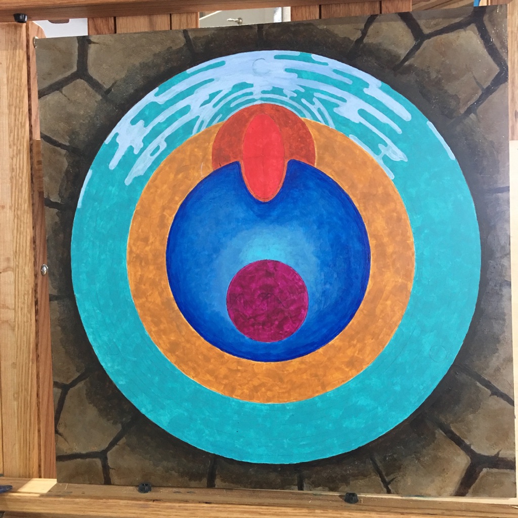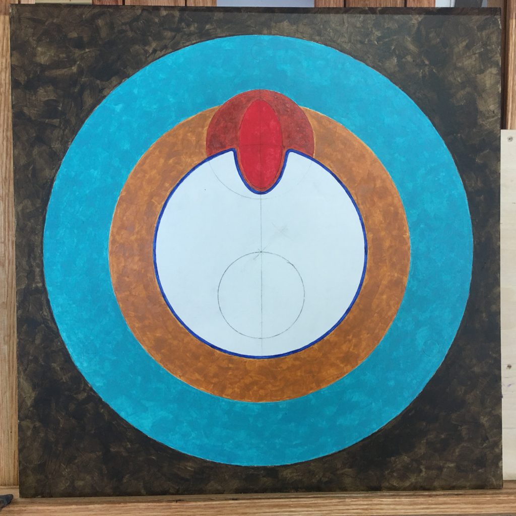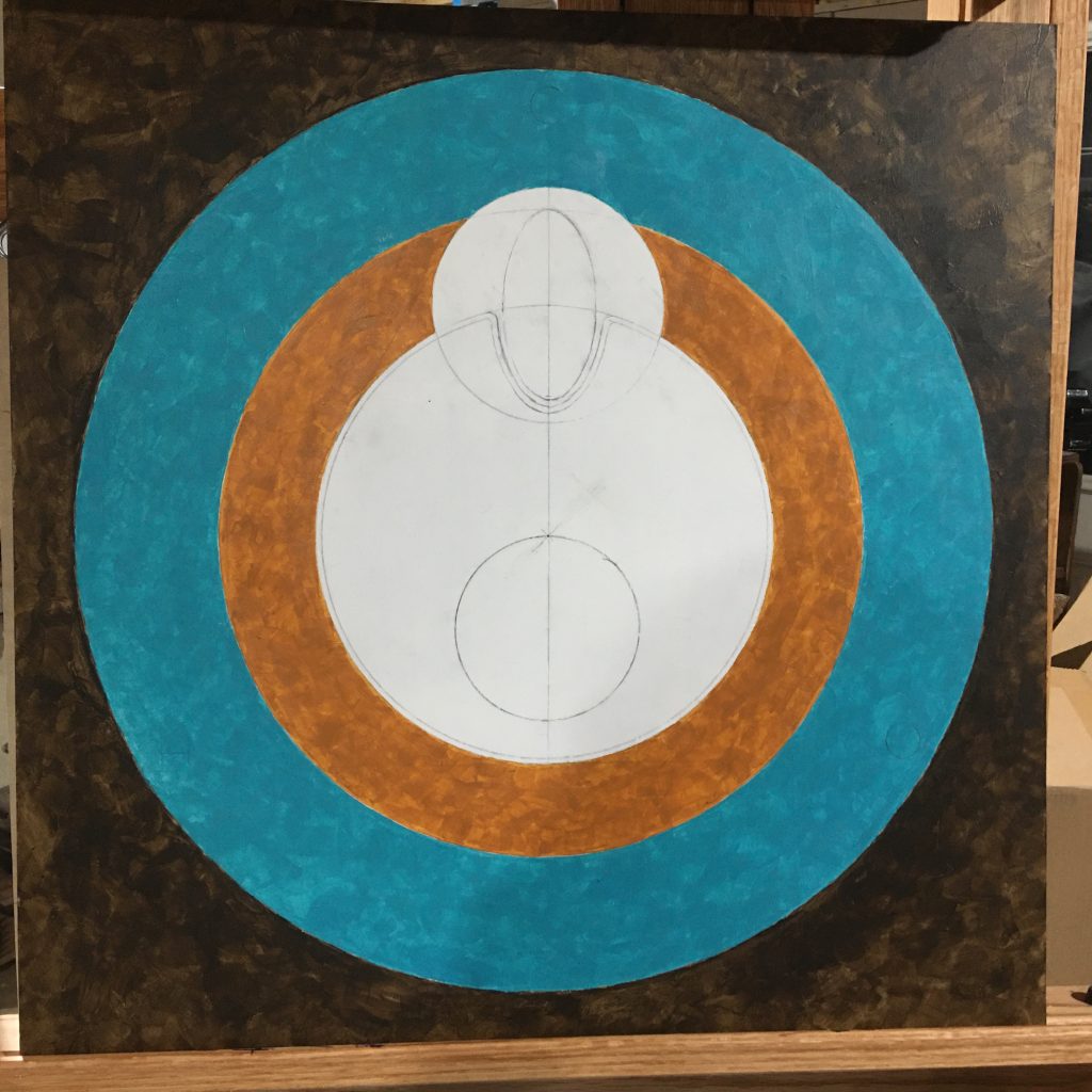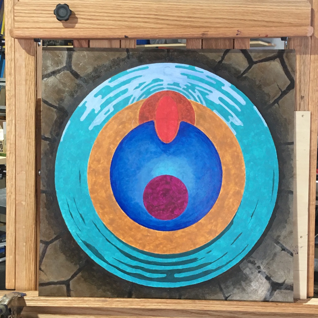 The geometry Begining underpainting Underpainting complete Beginning highlights and lowlights. Dried mud. Puddle Size applied for fake silver leaf
