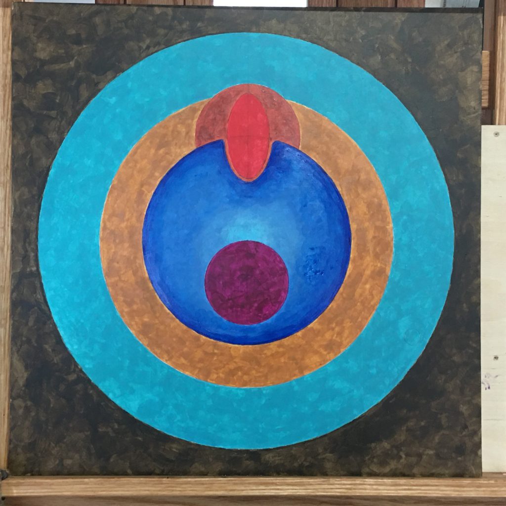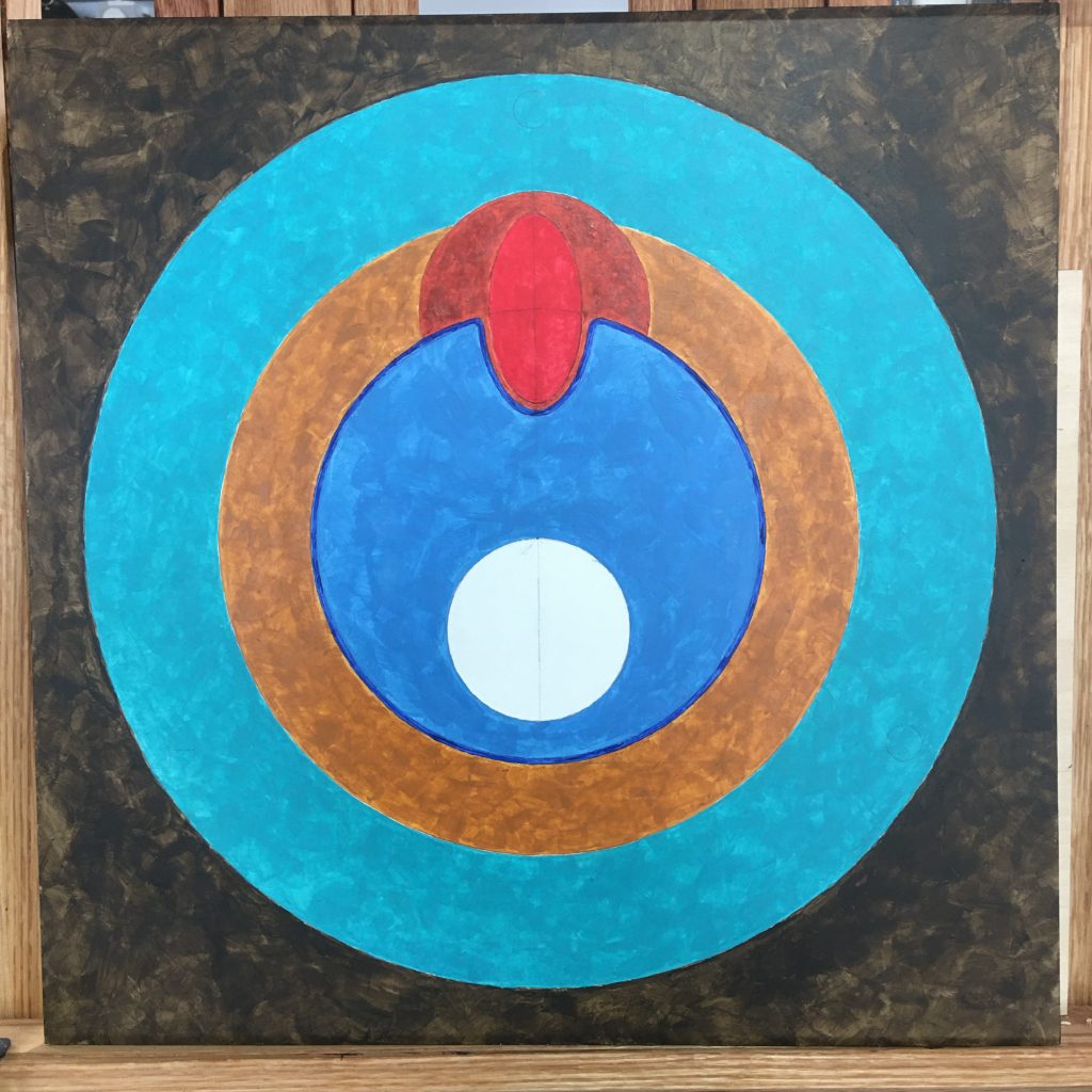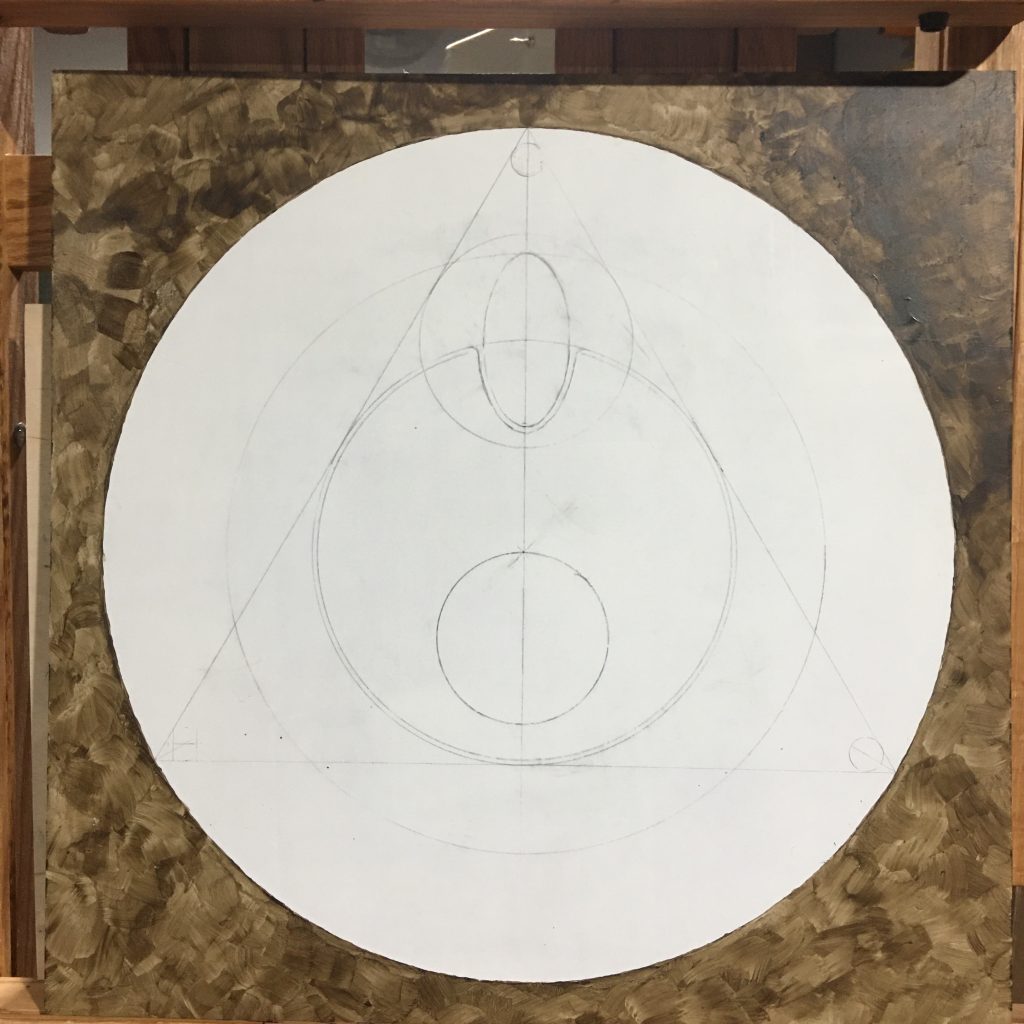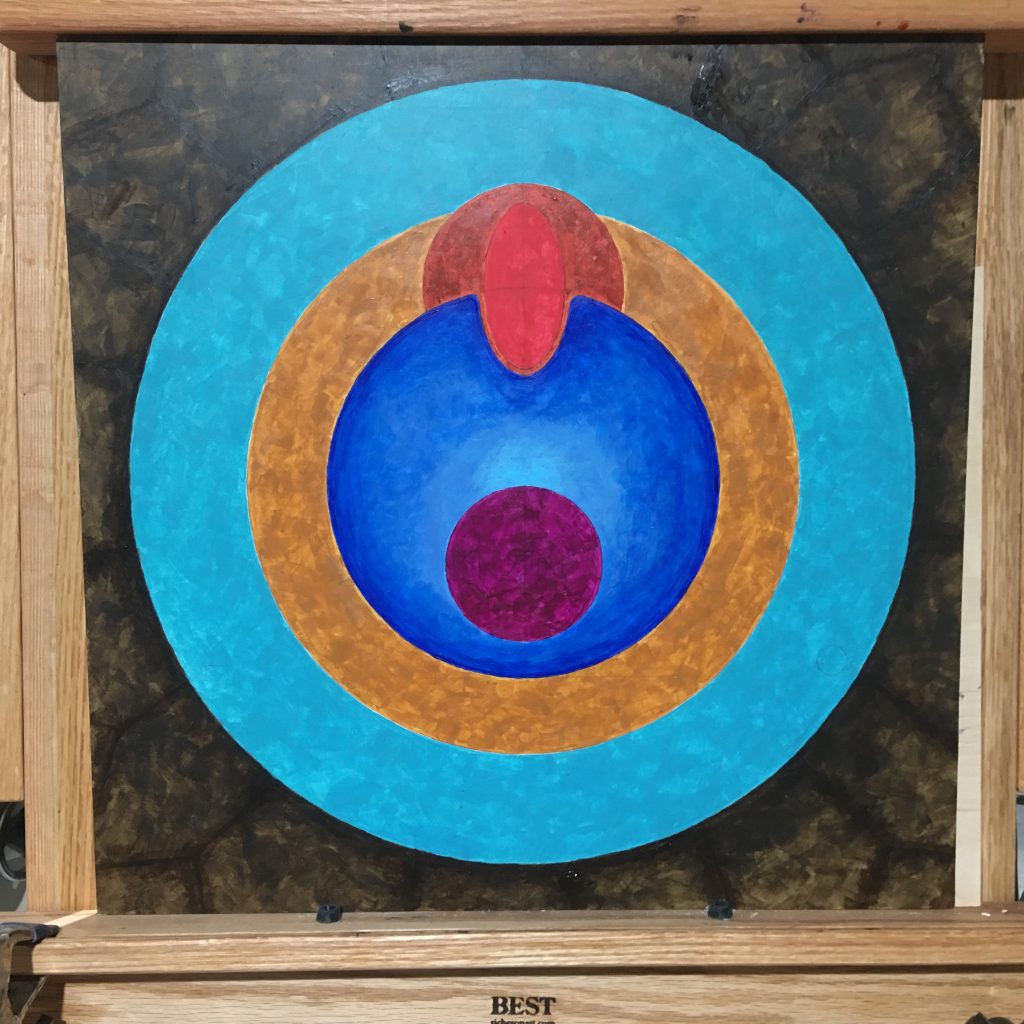 The geometry Begining underpainting Underpainting complete Beginning highlights and lowlights. Dried mud. Puddle Size applied for fake silver leaf
