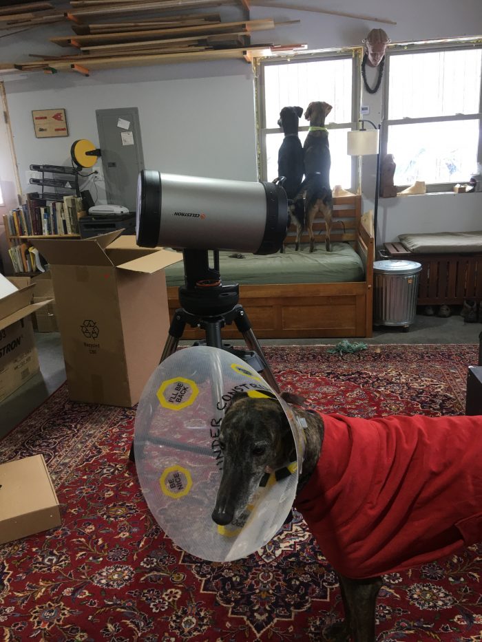 I finally landed a nice telescope. I picked a 9.25″ Celestron Evolution. And while his toenail heals up, my dog Möbius is testing our low-budget Radio Telescope, shown in the image above. He can’t seem to get it to work. Lord Byron and Odin care little for these lofty endeavors when there are cross country skiers to bark at.