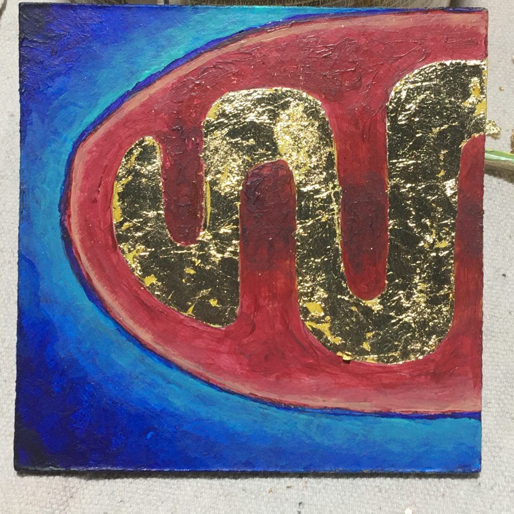 The first ideas that I am working with are centered on mitochondria, which were central for the ability of cellular life to sustain metabolic processes. Mitochondria have nodules of iron and sulfur, and so the red-orange-yellow colors suit them well, and an aqueous background makes sense, too, in blue. The unfortunate rendering here in my first sketch looks a good bit like the superman logo. Fortunately, the mitochondrion’s inner layers are grossly simplified here, so I have less superman-like options.