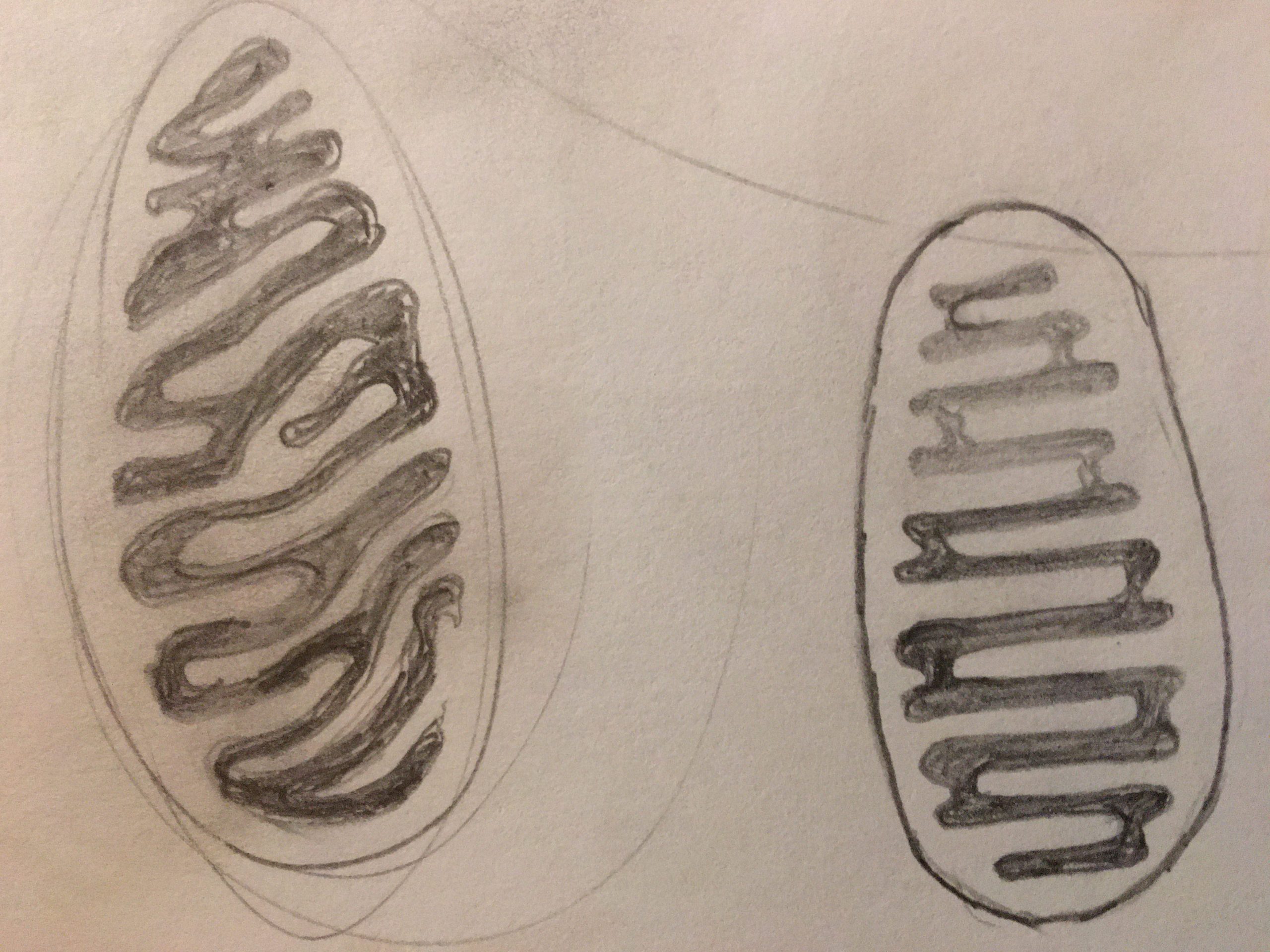 After a good bit of poking around the web and looking at SEM and TEM imagery of mitochondria, I tried a couple different systematic abstractions in pencil, here.